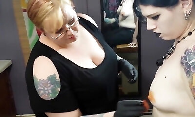 chesty inked tart brésilienne avec 2 gaufres de couleur foncée