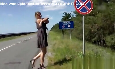 blonde exhibe ses gros seins à l'extérieur