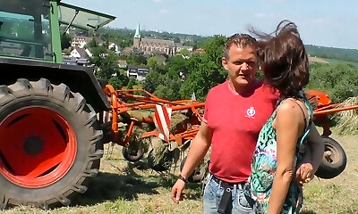 Leaned over the tractor mature village slut gets fucked from behind