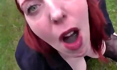 Red-haired Deutsch milf works that giant cock with her ass and mouth in the park