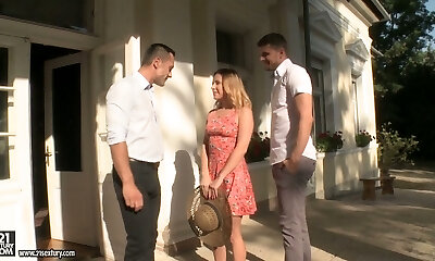 Two best friends nail beautiful shy girl Eveline Dellai in anus and coochie